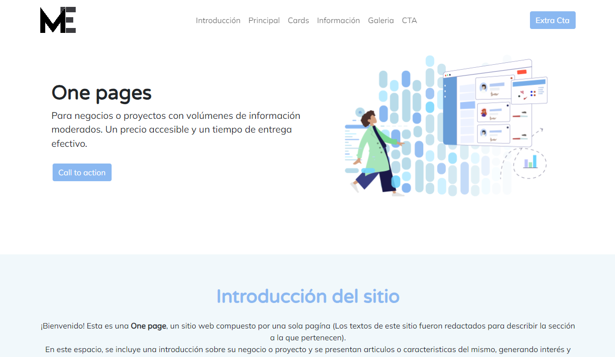 Una "One page" permite segmentar la información en una sola página web y con un menú facilita la navegación en las diferentes secciones que describen muy bien a una empresa, los productos que vende, los servicios que presta y demás información para convencer a los clientes potenciales de hacer negocios con la empresa.